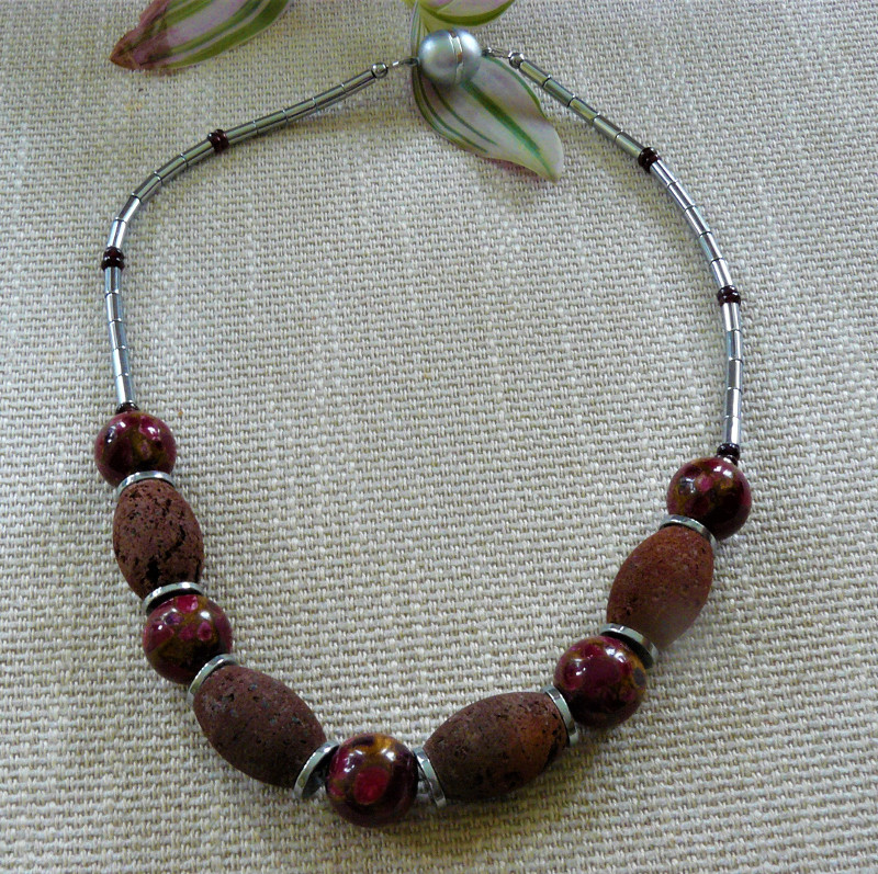 Art.-Nr. 1042 Lavatonnen 18x25mm, Quarzkugeln Ø18mm, Ø12mm, Hämatitröhrchen 4x8mm, Granatlinsen, Acrylmagnetverschluss, 27,00€