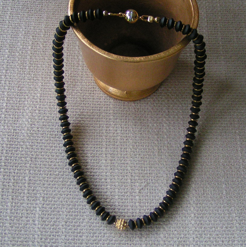 Art.-Nr. 587 Matte Onyxreifen Ø 8mm, goldfarbene Hämatitscheiben, Kugel aus vergoldetem 925 Sterling Silber mittig, Acrylmagnetverschluss, 49,00€