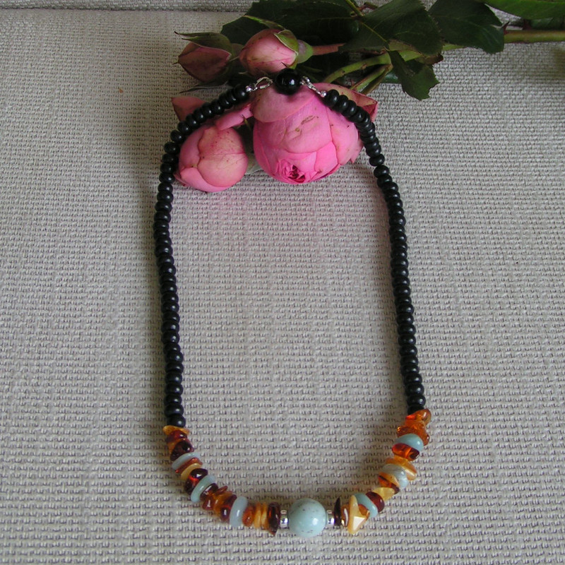 Art.-Nr. 671 polierte Onyxbuttons Ø6mm, Bernstein-, Amazonitsplitter, Amazonitkugel Ø10mm mittig, Zwischenteile aus 925 Sterling Silber, Acrylmagnetverschluss, 49,00€