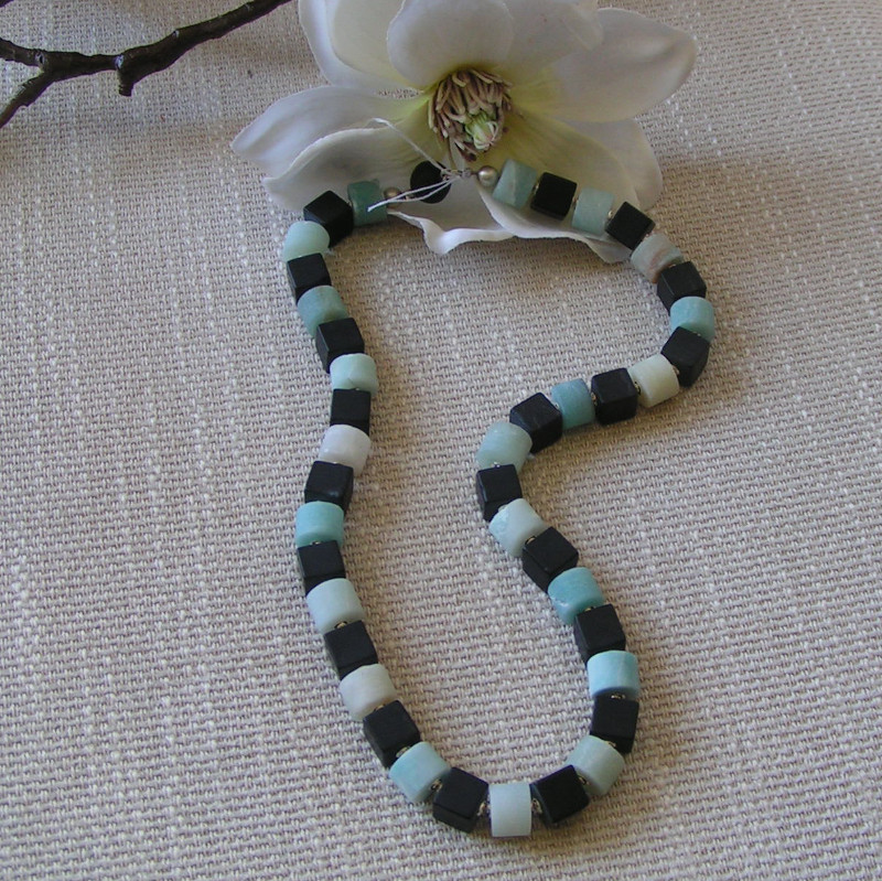 Art.-Nr. 679 Matte Onyxwürfel 10x10mm, Amazonitbuttons, Halblinsen Ø4mm aus 925 Sterling Silber, Acrylmagnetverschluss, 69,00€