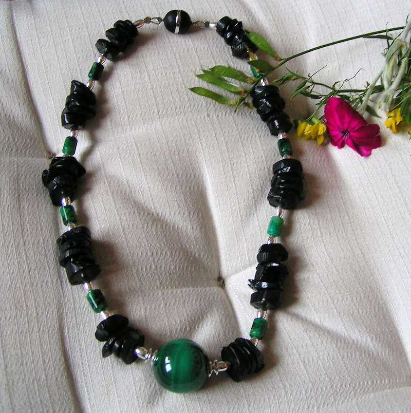 Art.-Nr. 792 Schwarze Shellscheiben, Zwischenteile (Oliven+Linsen) aus 925 Sterling Silber, Malachitrollen, Malachitkugel Ø22mm mittig, Acrylmagnetverschluss, 49,00€