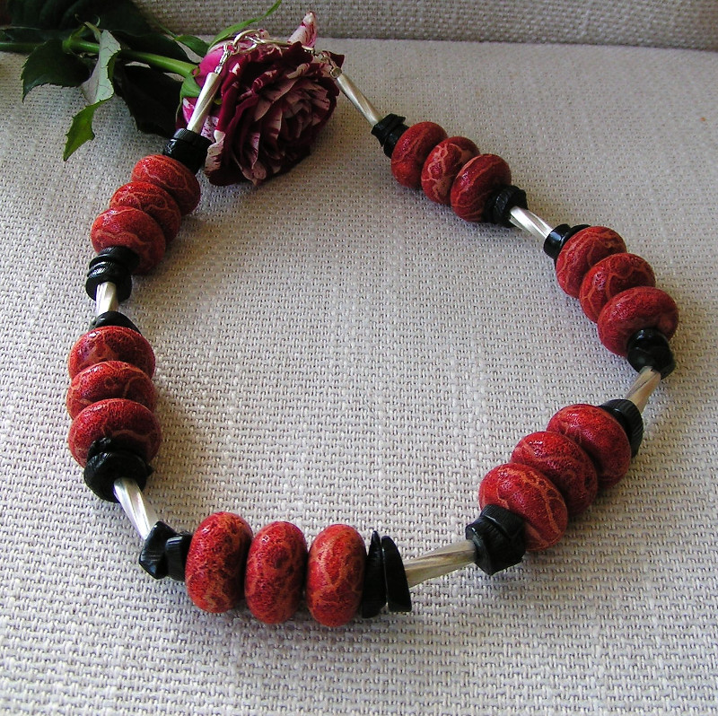 Art.-Nr. 794 Matte von der Struktur her außergewöhnliche Schaumkoralle Linsen Ø22mm, schwarze Shelsplitter, gedrehte Silberstangen und Hakenverschluss aus 925 Sterling Silber, 98,00€