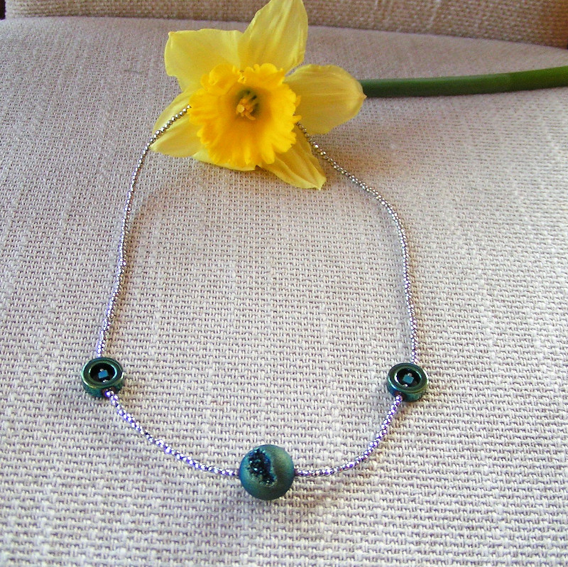 Art.-Nr. 878 Geodenachatkugel Ø14mm mittig, facettierte Hämatitkugeln Ø2mm, glänzende Hämatitdonuts Ø14mm, matte Hämatitwürfel 3x3mm, Acrylmagnetverschluss, 42,50€