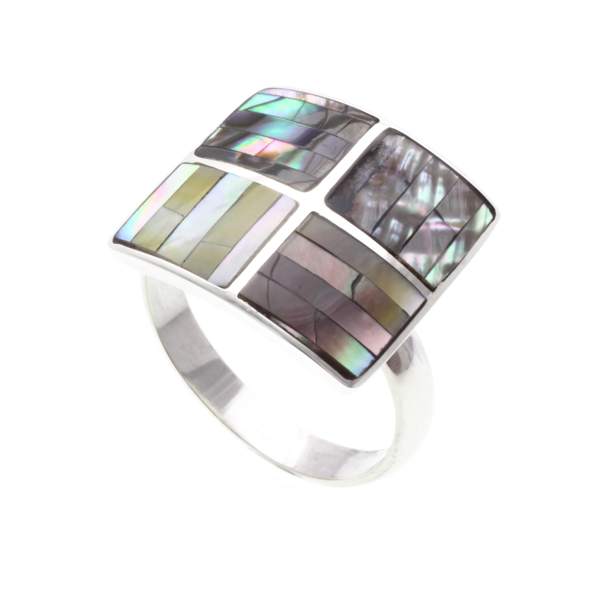 Art.-Nr. DUR-R4442 Quadratischer Ring aus geschnittenen Muschelstäbchen, schillernd in 4 Farben, gefasst in 925er Sterlingsilber rhodiniert, variabel einstellbar, Höhe: 1,6cm, Breite: 1,6cm, 55,90€