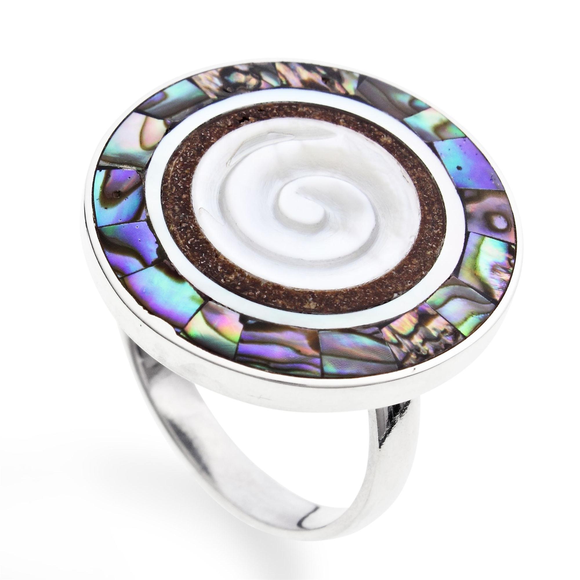 Art.-Nr. DUR-R4508 Großer runder Ring aus Perlmutt mit Spiralmuster und Lava-Einlage, umrahmt von Seeopal-Stückchen aus 925er Sterling-Silber, Ø 2,3cm, variabel, 24,90€