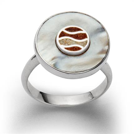 Art.-Nr. DUR-R5405 Ring ´´Strandlust„ rund mit Perlmutt, Strandsand und Bernsteinsand gefasst in rhodiniertem 925er Sterlingsilber, verstellbar, erhältlich in Gr. M+L, 87,00€
