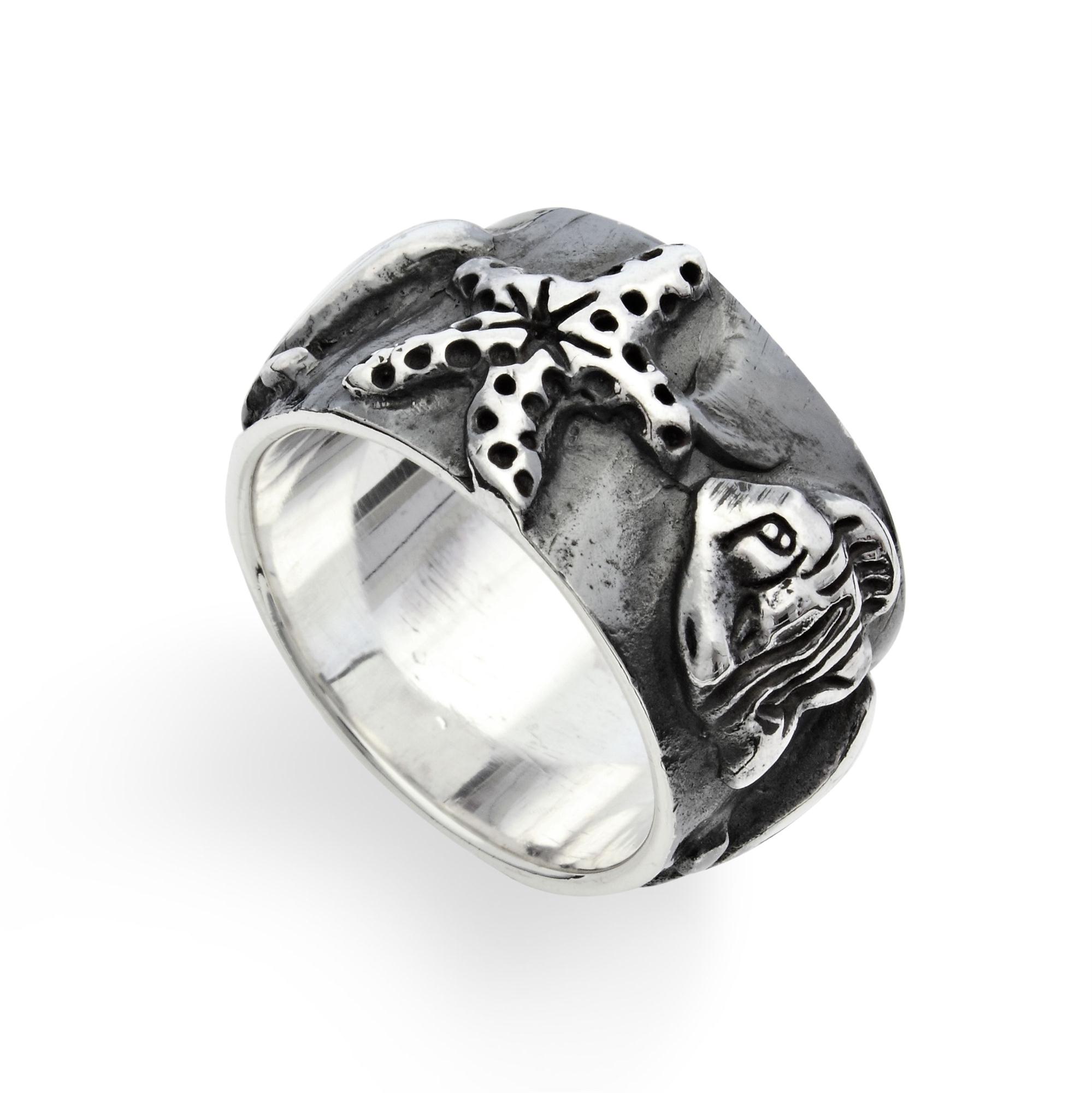Art.-Nr. DUR-R4561 Breiter Bandring „Meeresschatz“ mit silbernen, rundherum verlaufenden Meeresmotiven auf oxidierter Oberfläche aus 925er Sterling-Silber, Höhe: 1,2cm, Breite: 2cm, auch in Gr. 62 erhältlich, 89,90€