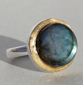 Art.-Nr. Ca-RS1740N „Silberring „Flat round small“ teilvergoldet mit Labradorit“ Maße: 3,5 mm Ringschiene, Labradorit 15mm, 160,00€